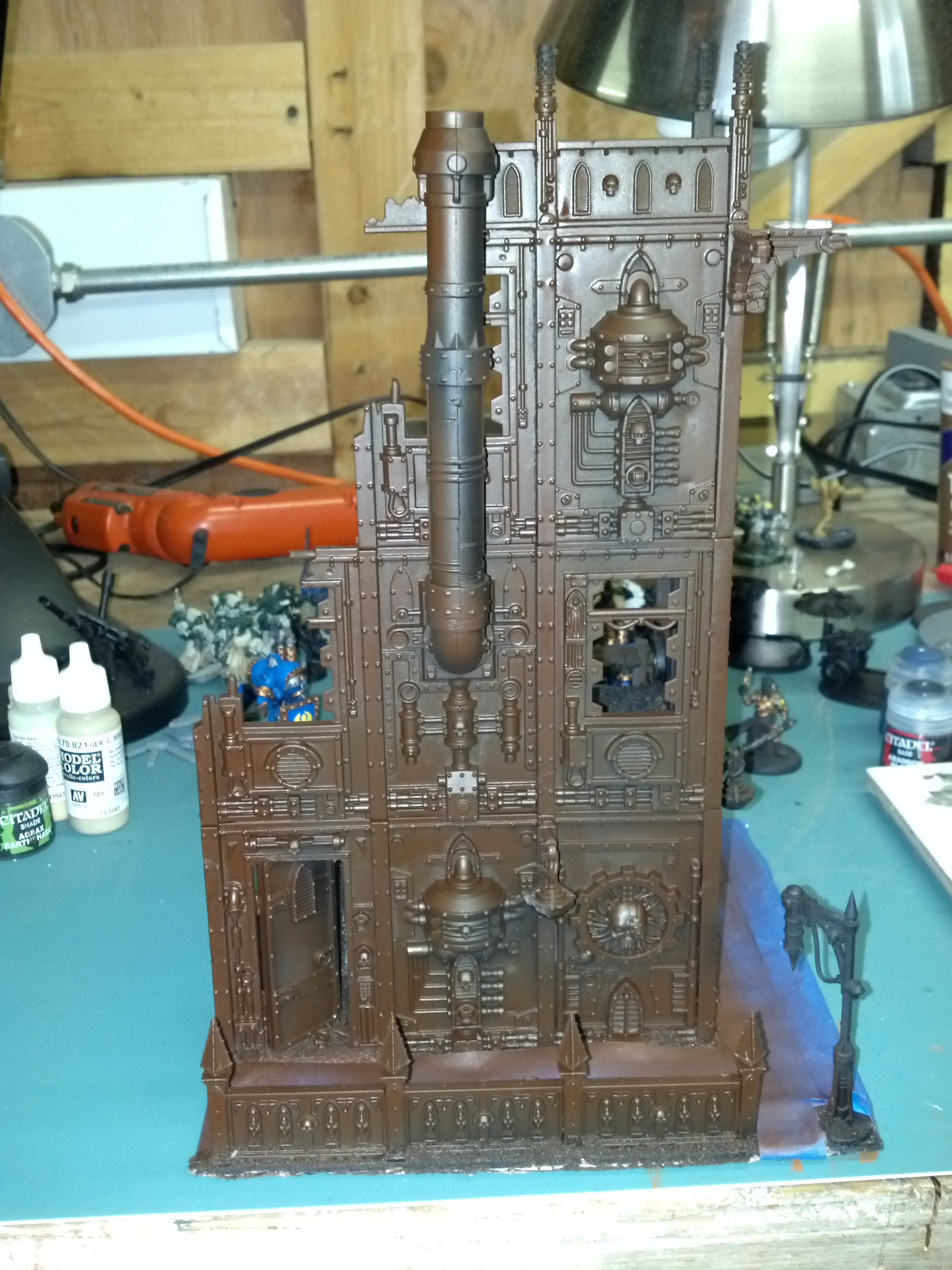 I finally basecoated this industrial building with Vallejo Air Mahogany. It will have a ton of metallic details.