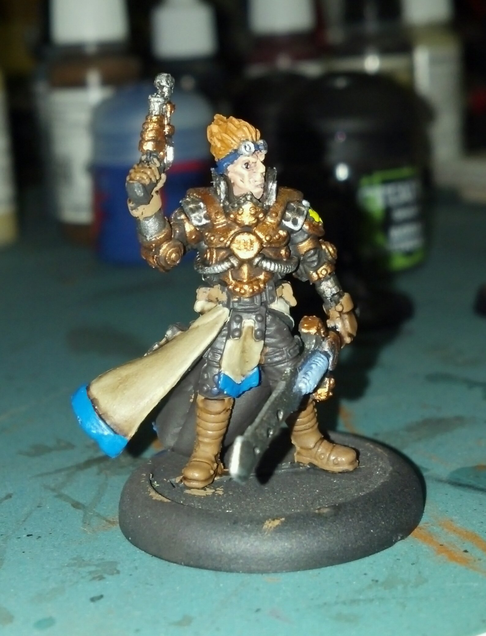 This Warmachine figure just needs some detail work and final highlights. I was brave and painted his eyes! I am very happy with how leathery his cape came out.