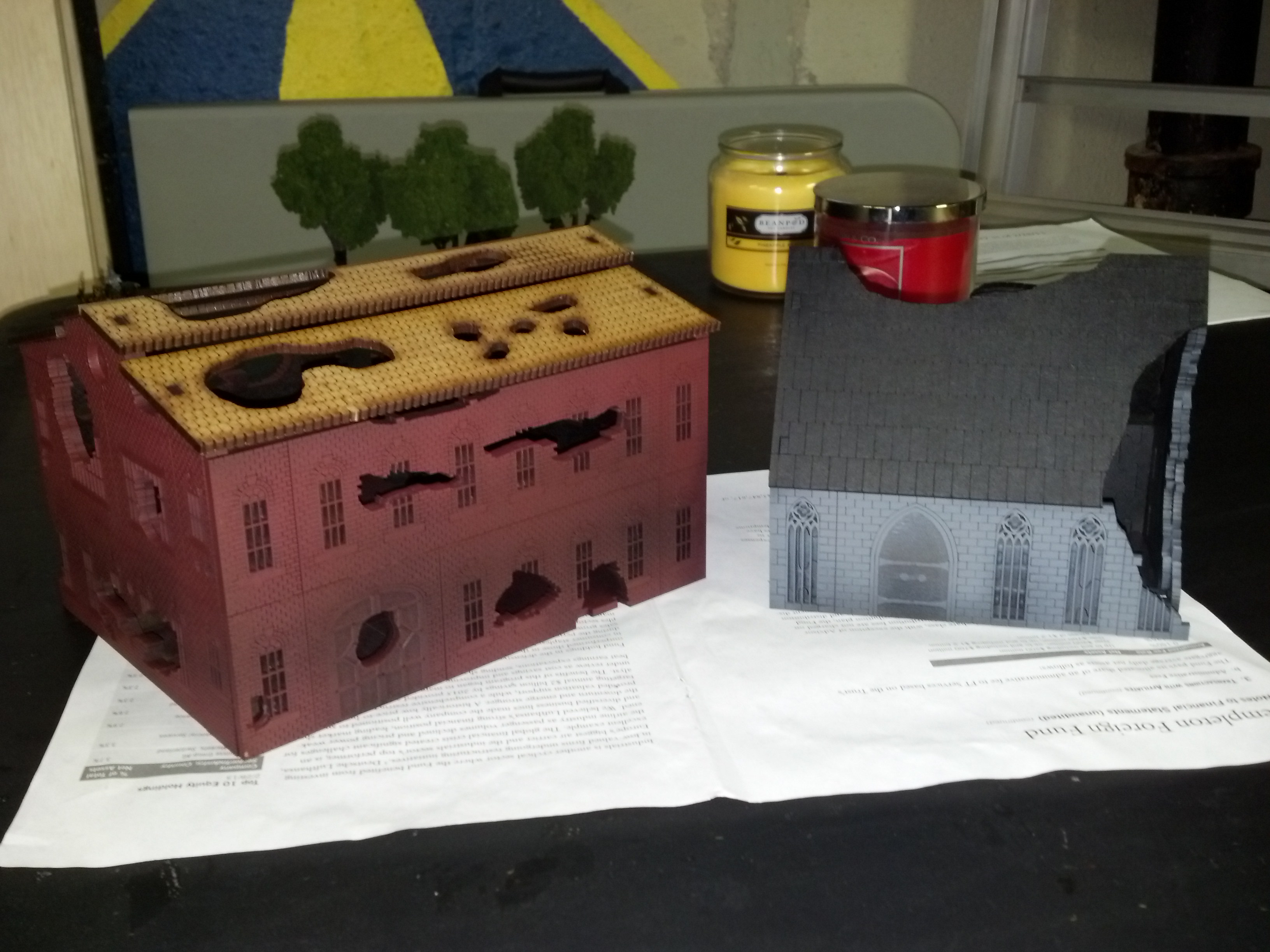 These are laser cut mdf buildings. They have been assembled, primed, and basecoated. The brick building has had some simple highlights applied. Detail work is all that remains.