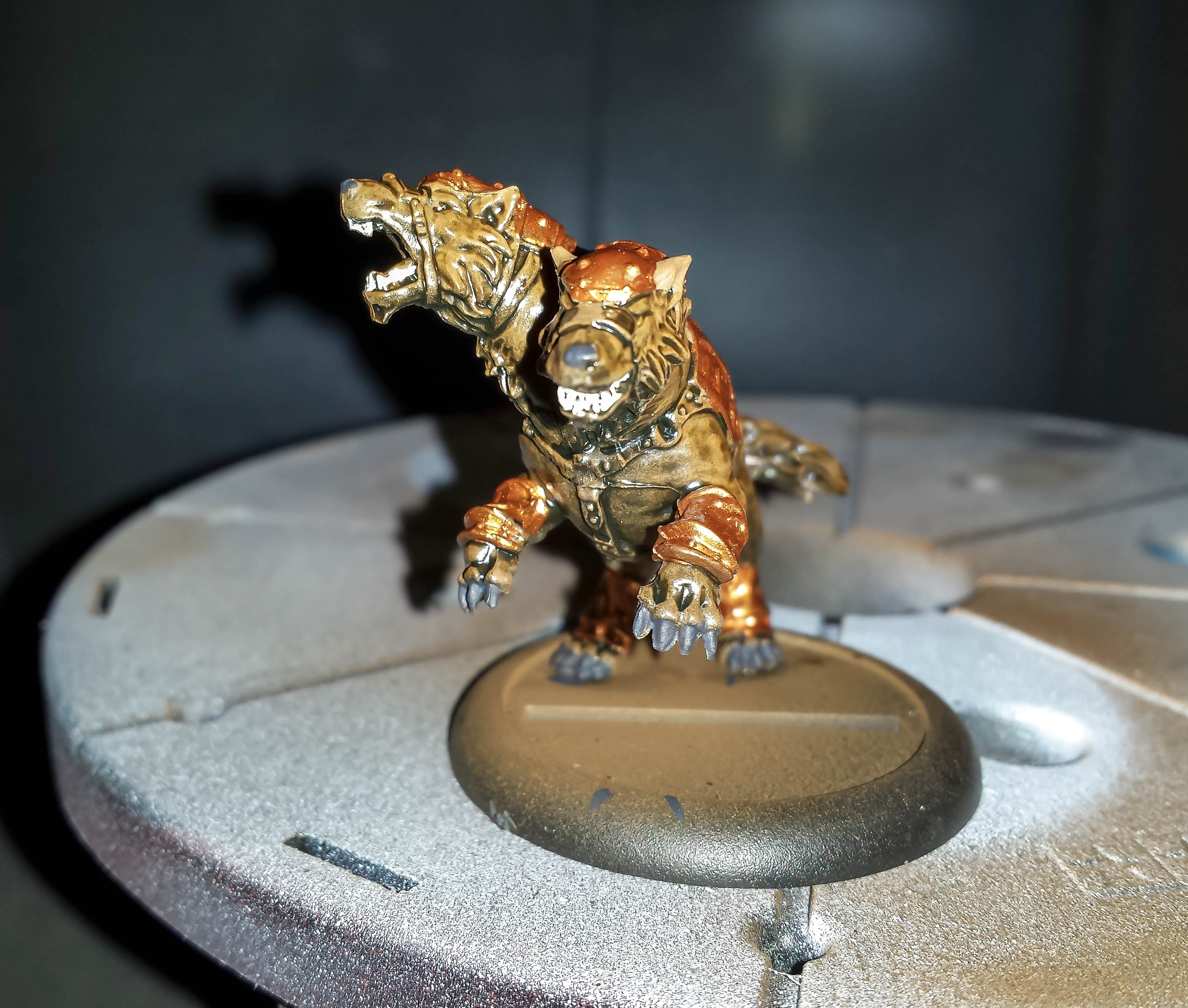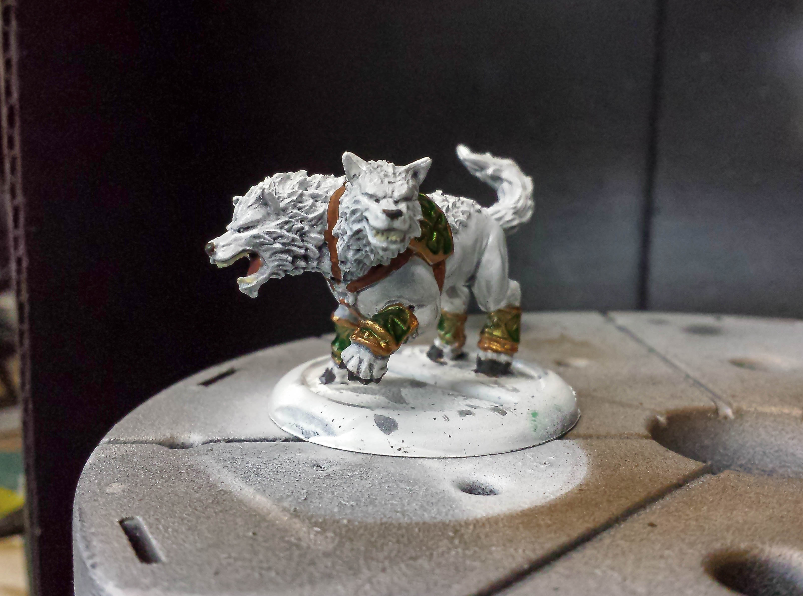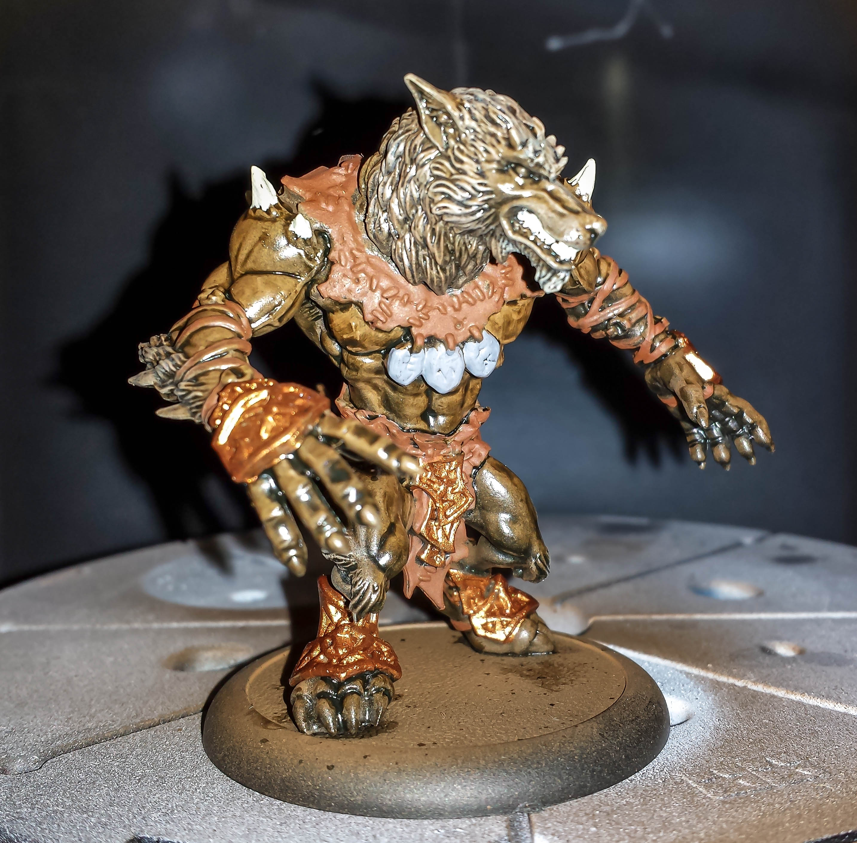The brown wolf had his teeth and nails done. I also did the basecoat for his brass parts. He’s ready for some leather and verdigris!