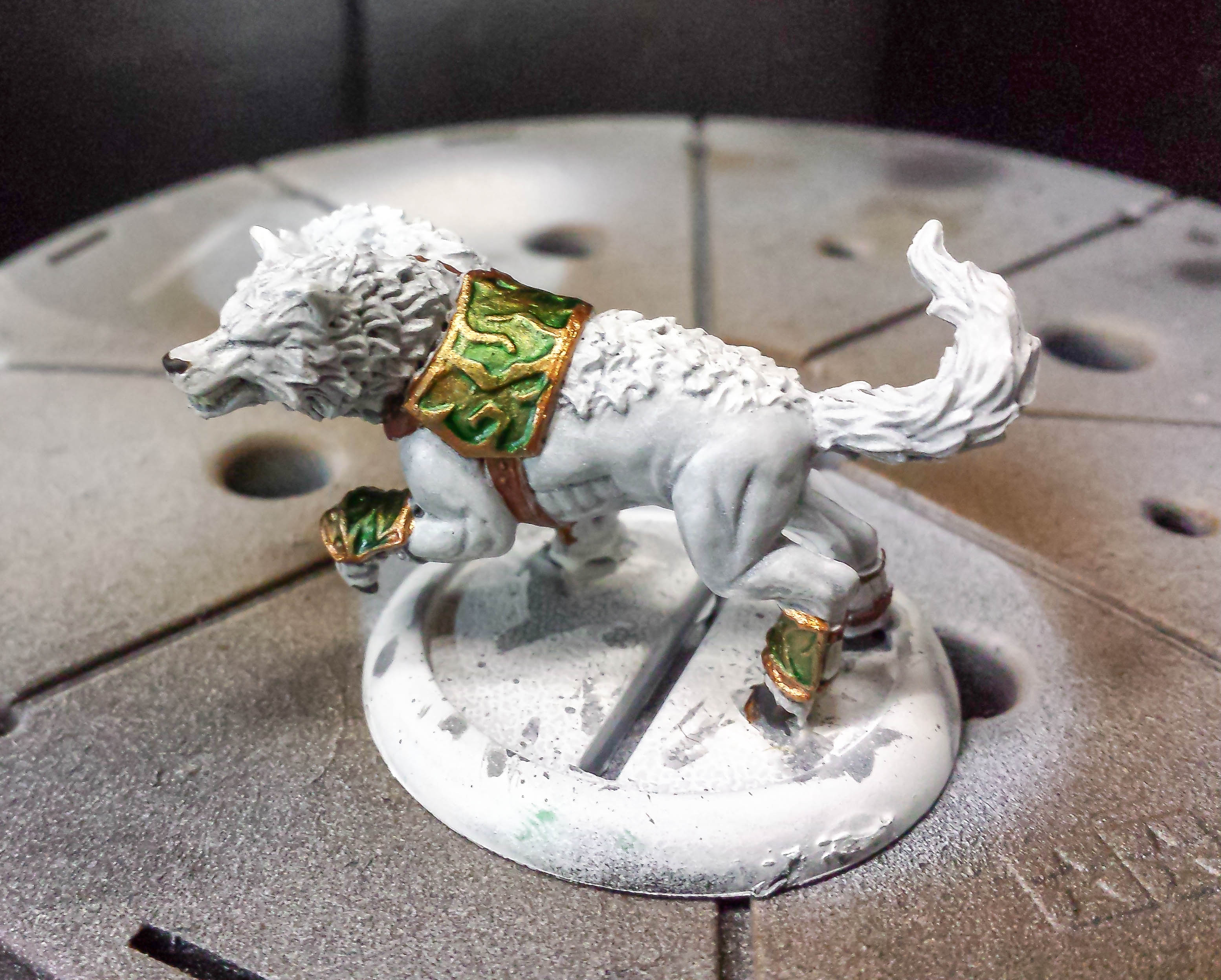 The white wolf had some leather detail added. I also tested out some verdigris on the brass parts. I am happy with the way it came out. This guy just needs some cleanup and highlighting before he’s ready to base!