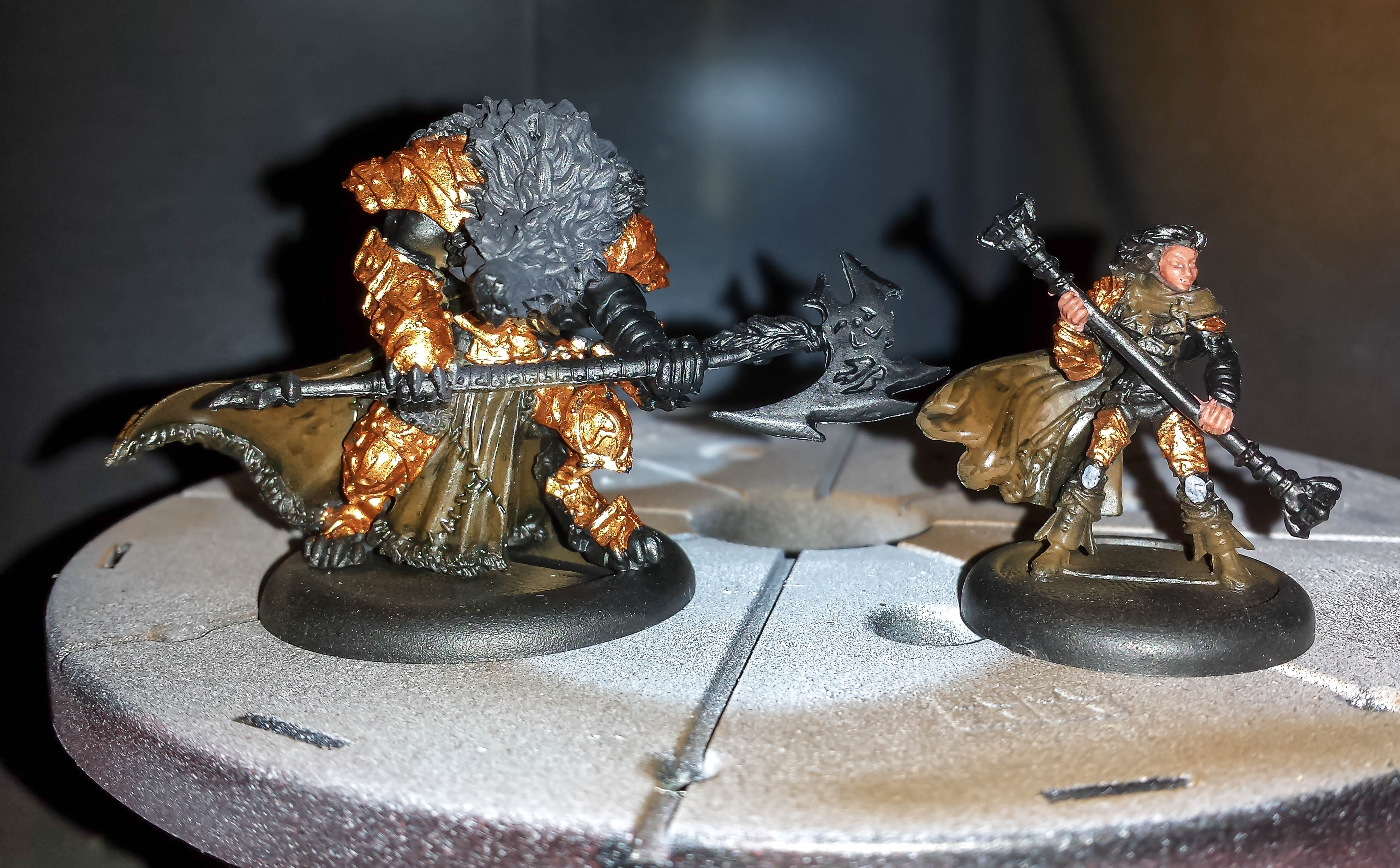 The small wolf-man have a TON of brass parts. This is the first guy I wish I had painted before fully assembling. I still have 4 more of them to go! The human was much easier, and is coming along well. The grey spots at her knees are stone.