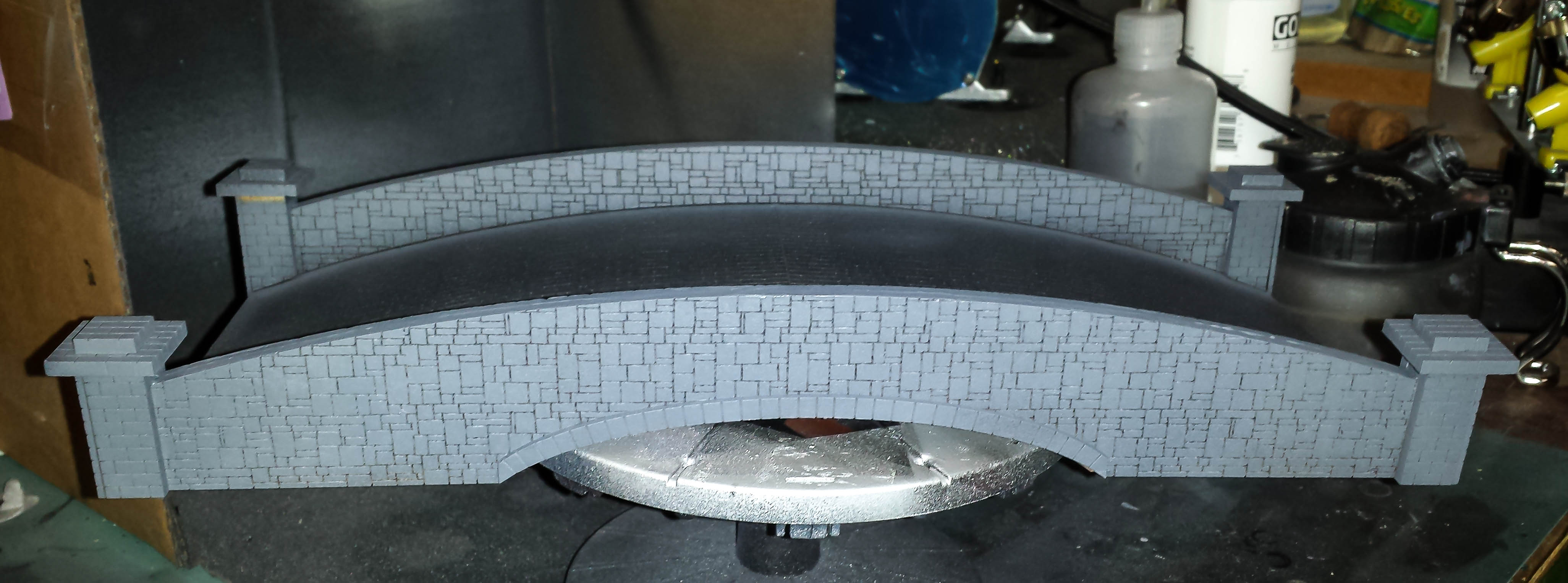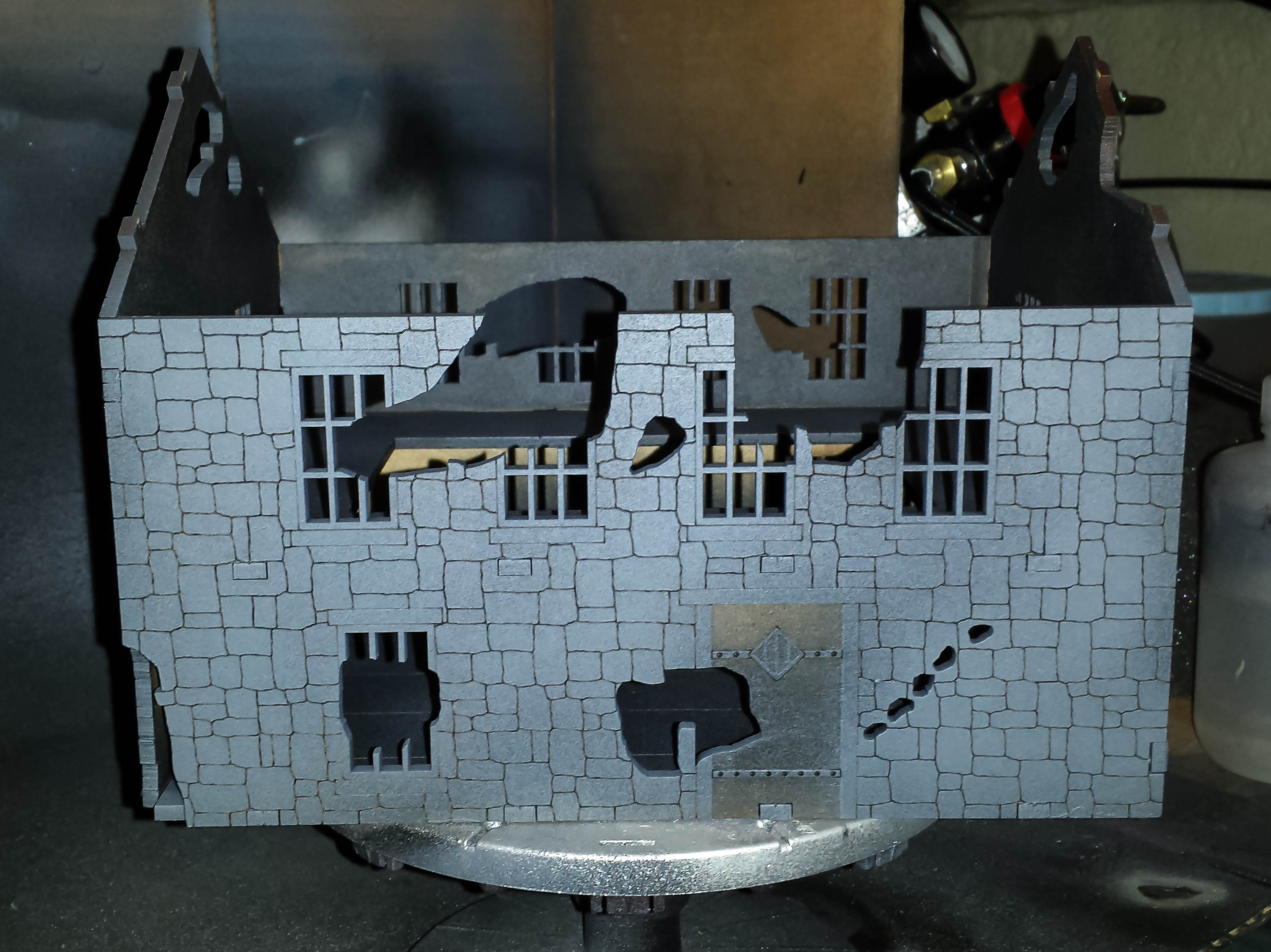 A nice grey base coat has been applied to the stone building. Because these are lasercut MDF, they don’t take drybrushing very well… I’ll have to experiment with airbrushing different layers.