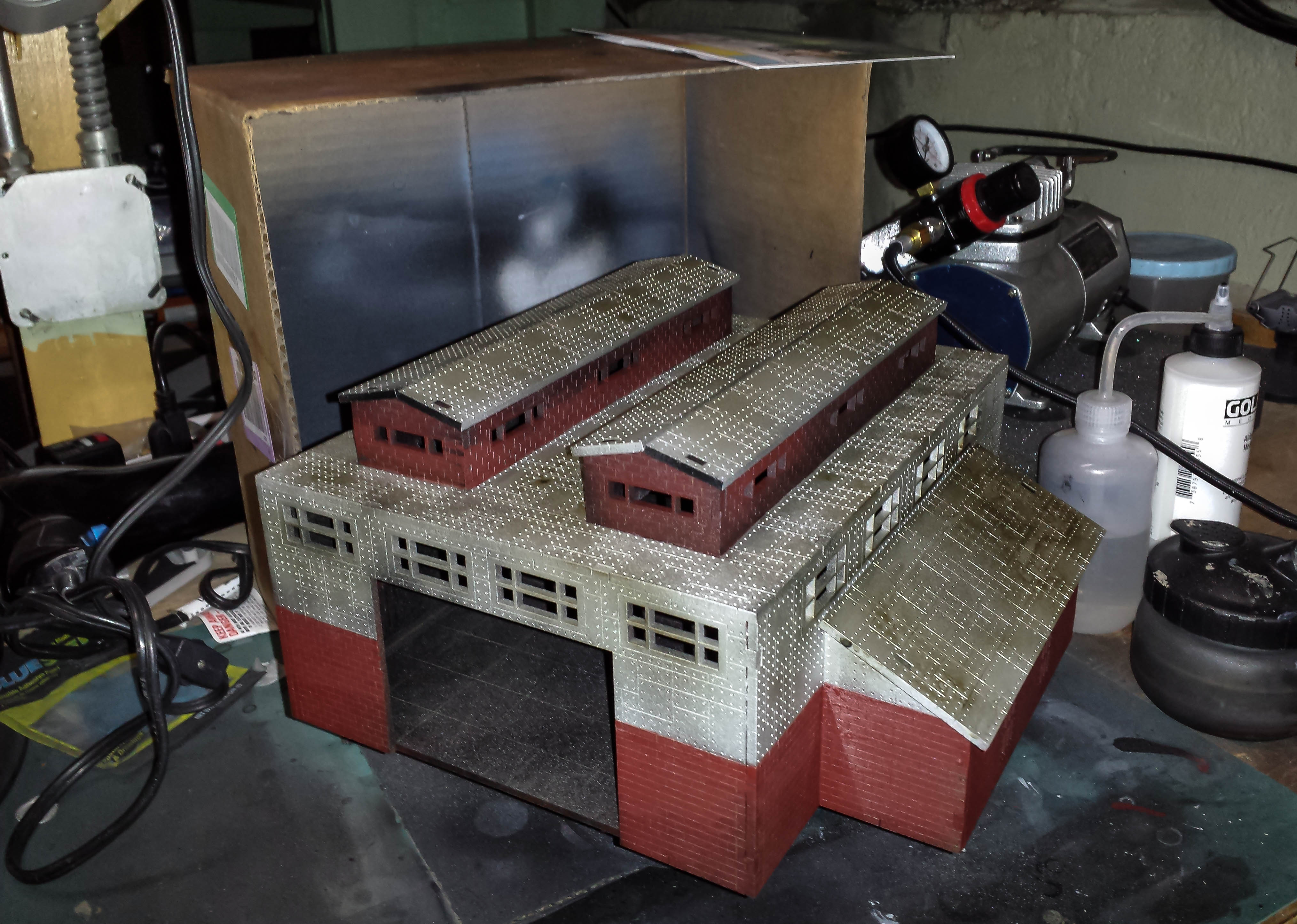 I added silver to the upper portion of the warehouse. I held a piece of card in place as a mask, which worked out fairly well, but did require a little bit of cleanup. Once this was done, I dirtied up the silver by airbrushing some Secret Weapon armor wash. This was the first time I have run a wash through the airbrush, and it worked out perfectly for this. I’m not sure I would use the technique on a mini, but in this case, I wanted it to be messy and pool on the flat surfaces. Next, I’ll add some rust with the airbrush, then wash again. After that, I’ll add some rust streaking, either with rust powder, or an oil wash… maybe both!