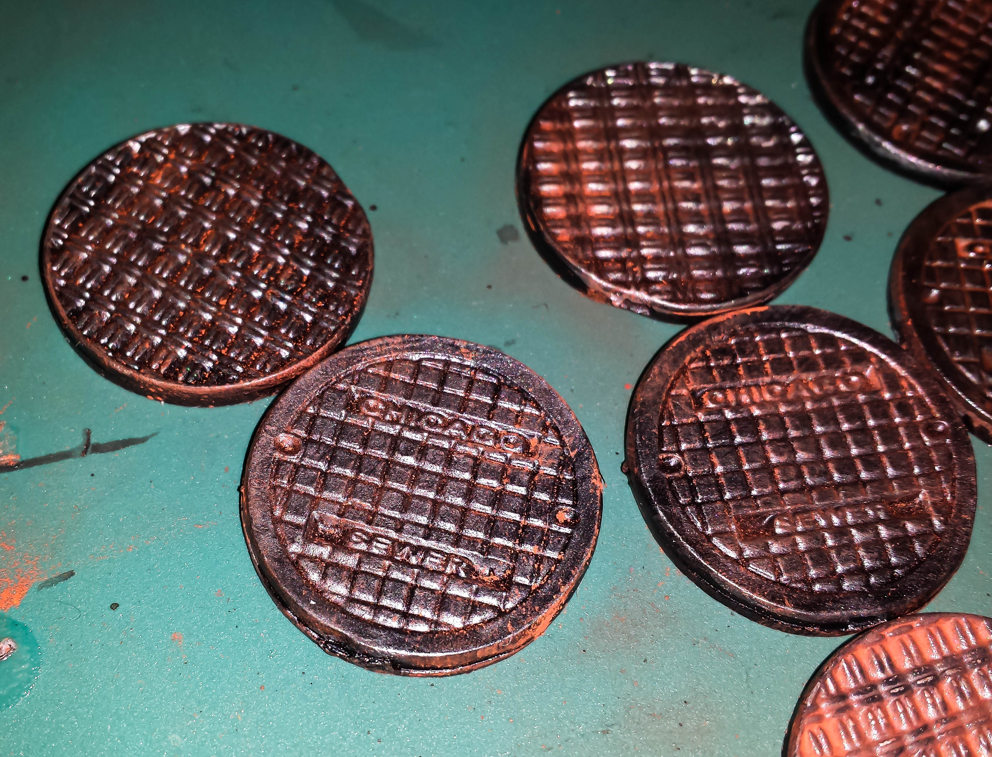 These are manhole covers that will be used as objective pieces for an upcoming wreck-age scenario. I primed black, did a rough, heavy silver drybrush, heavy black wash, then rust powders. This was my first time experimenting with the rust powders. for the more subtle effect, I stippled it on, then fixed it in place with some white spirits. The very heavy rusting was applied as a wash, made from the powder and white spirits. I may do a light silver drybrush on the edges, and possibly a light black wash before spraying with matte varnish.