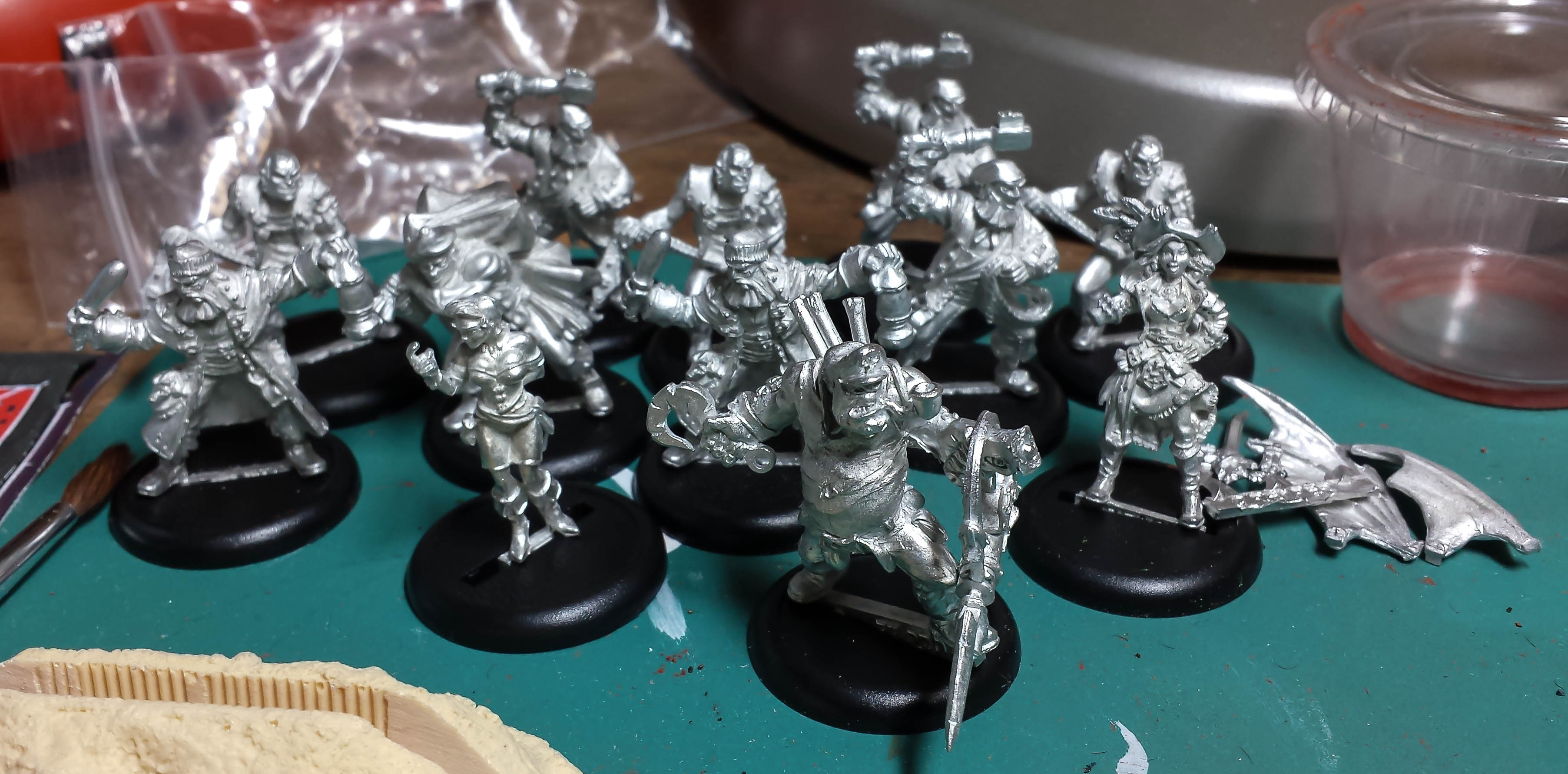 Pirates! At the Chicago Skirmish Wargames swap meet a couple of weeks ago, I picked up the big dude in the front, and decided that a group of pirates would be a fun project. The press gang in the back are by Privateer Press, and the partially assembled winged pirate lady on the right is Reaper.