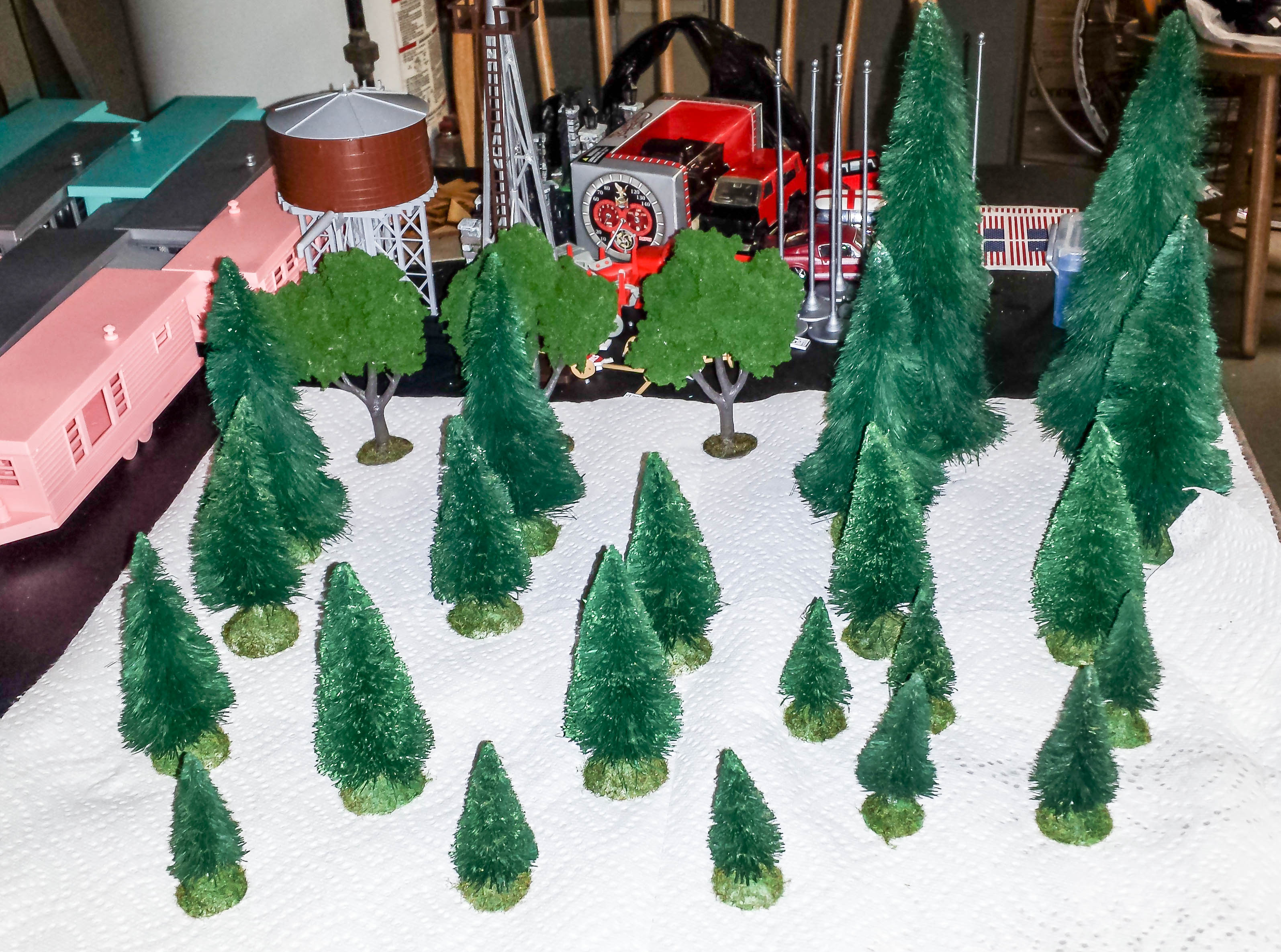Trees! These were also swap meet prizes. Half of them were snowy, and the other half didn’t have any bases. I made bases out of Sculpey, and then airbrushed them all a nice uniform green color. I flocked the bases, and also added a little flock to the trees themselves for some color variation. The trailer park will have a nice, thick forest near it!