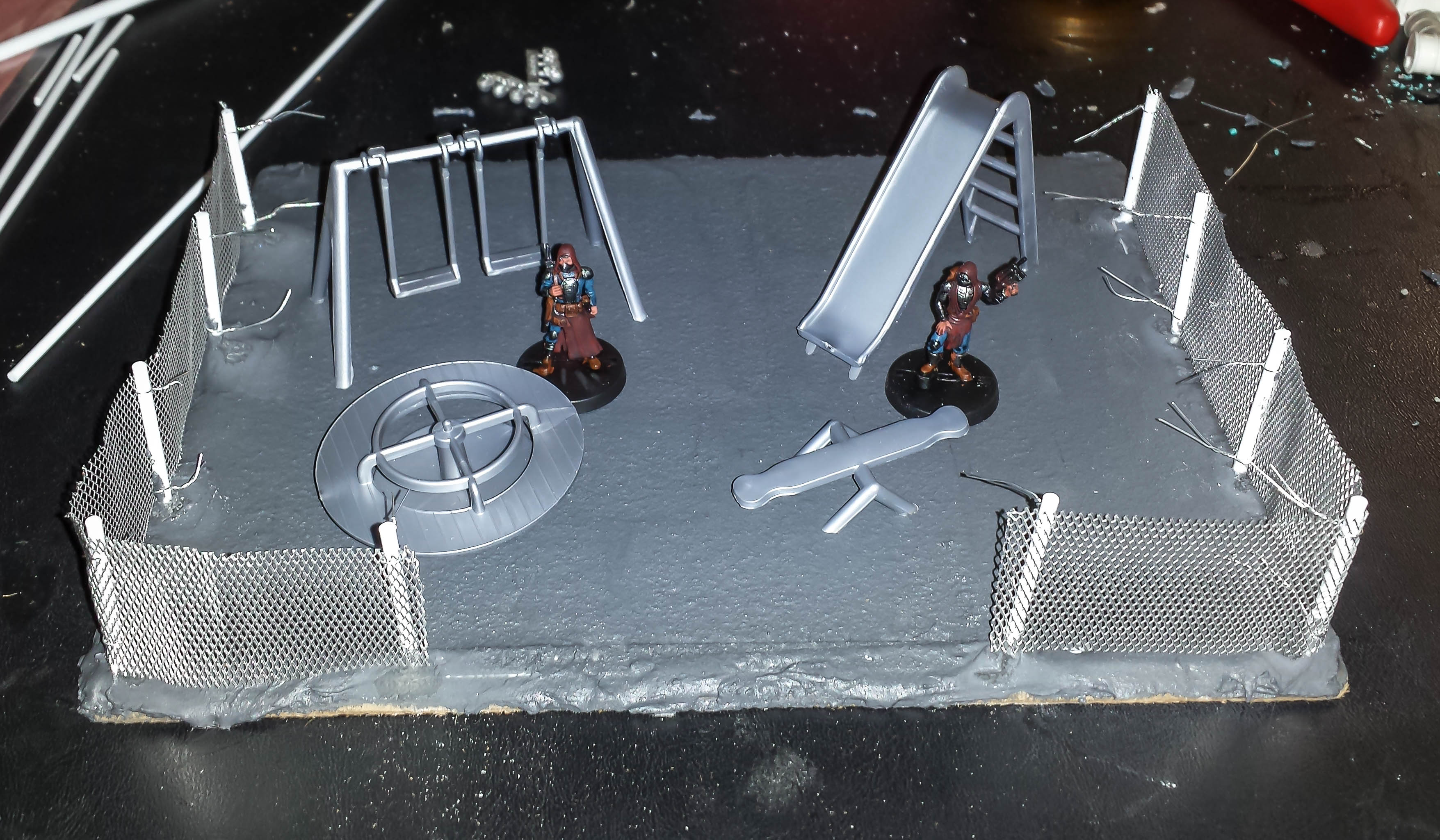 This gives you an idea of what the finished product will look like. the back wall will be a brick wall with a layered sort of seating area. The swings and merry-go round actually work. The teeter-totter neither teeters, nor totters.