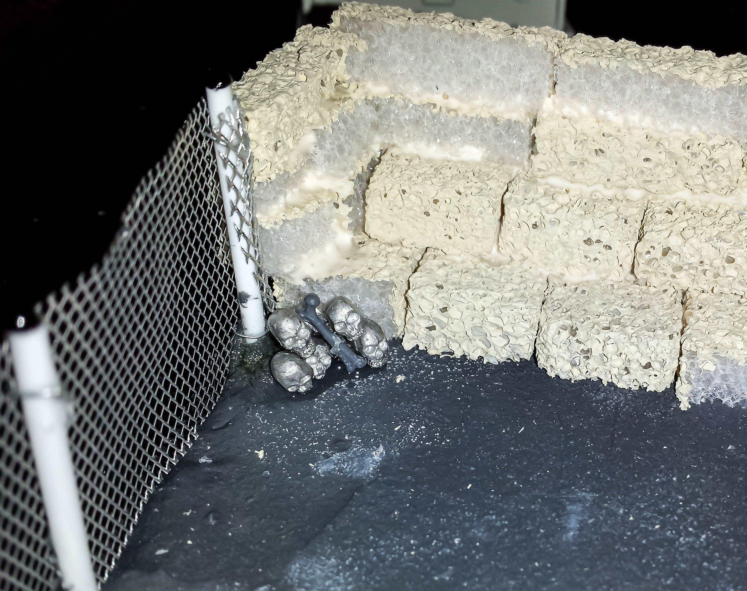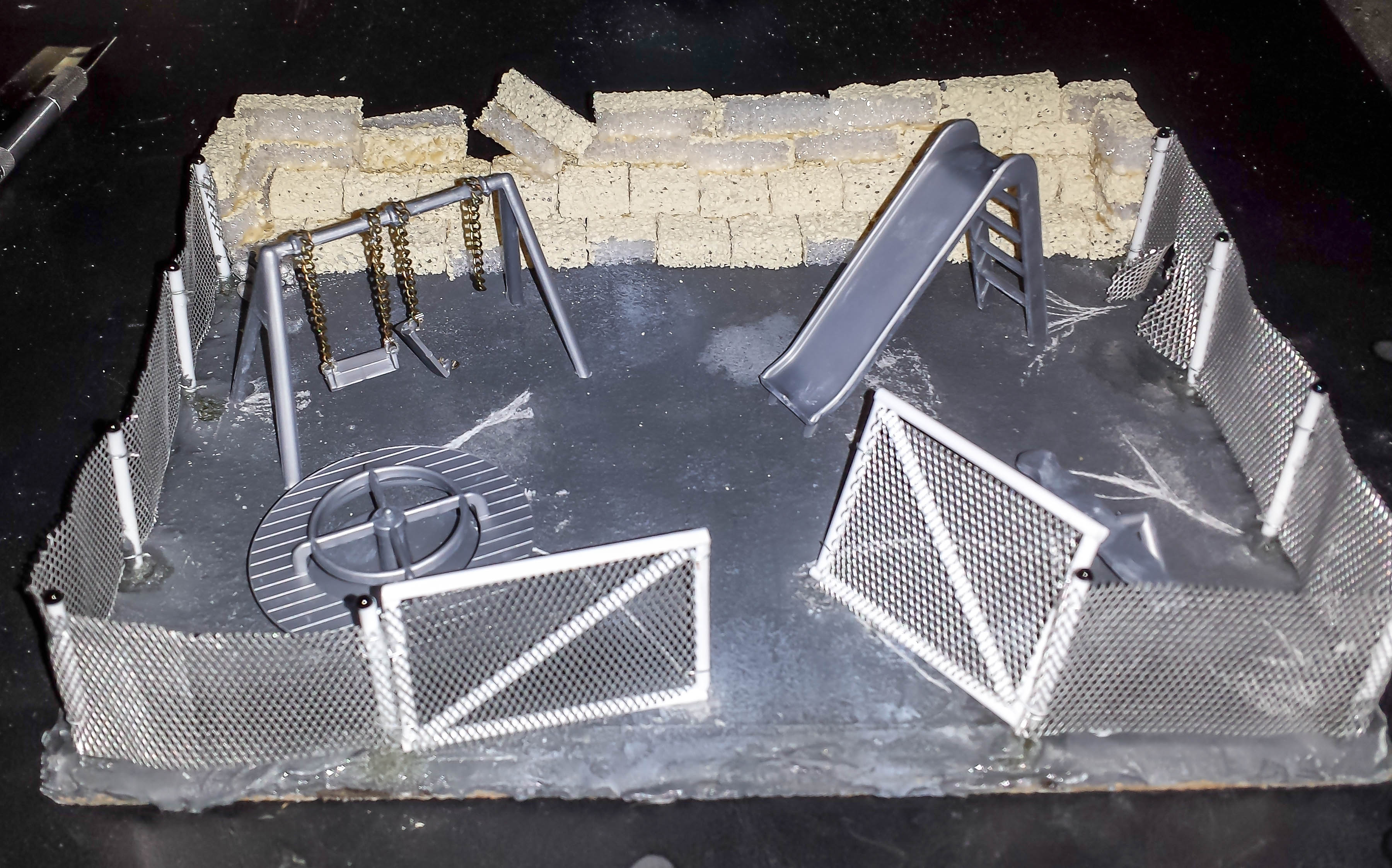 The stone wall has been built at the rear of the playground. it is made from styrofoam blocks I picked up at Michaels. I cut them to size using a serrated kitchen knife. wood glue holds them together. I also gouged out some scratches in the asphalt. Time to prime! I am going to prime and paint the playground equipment separate from the main piece, and attach them last. Notice the little half beads that I used to cap the fence posts.
