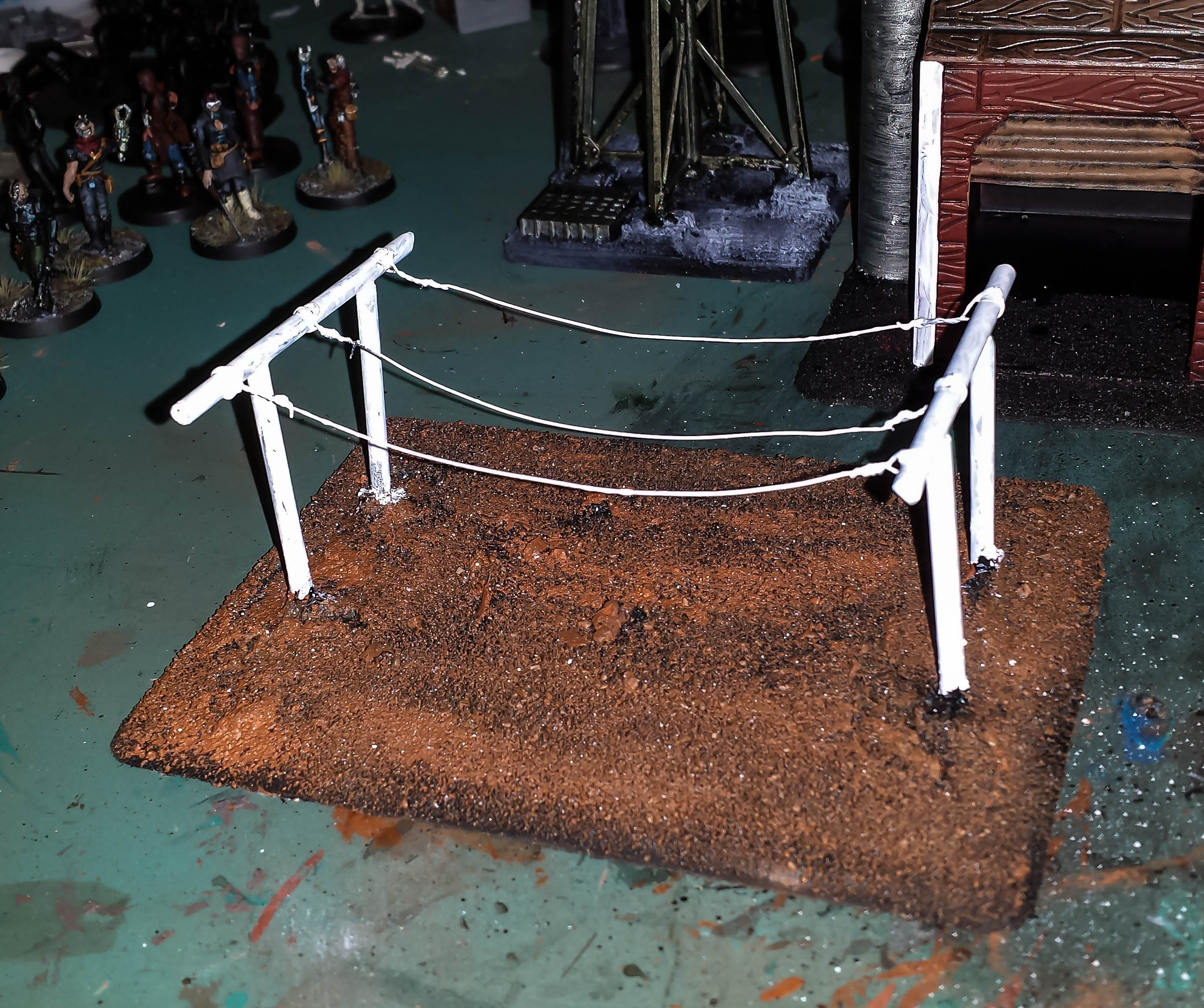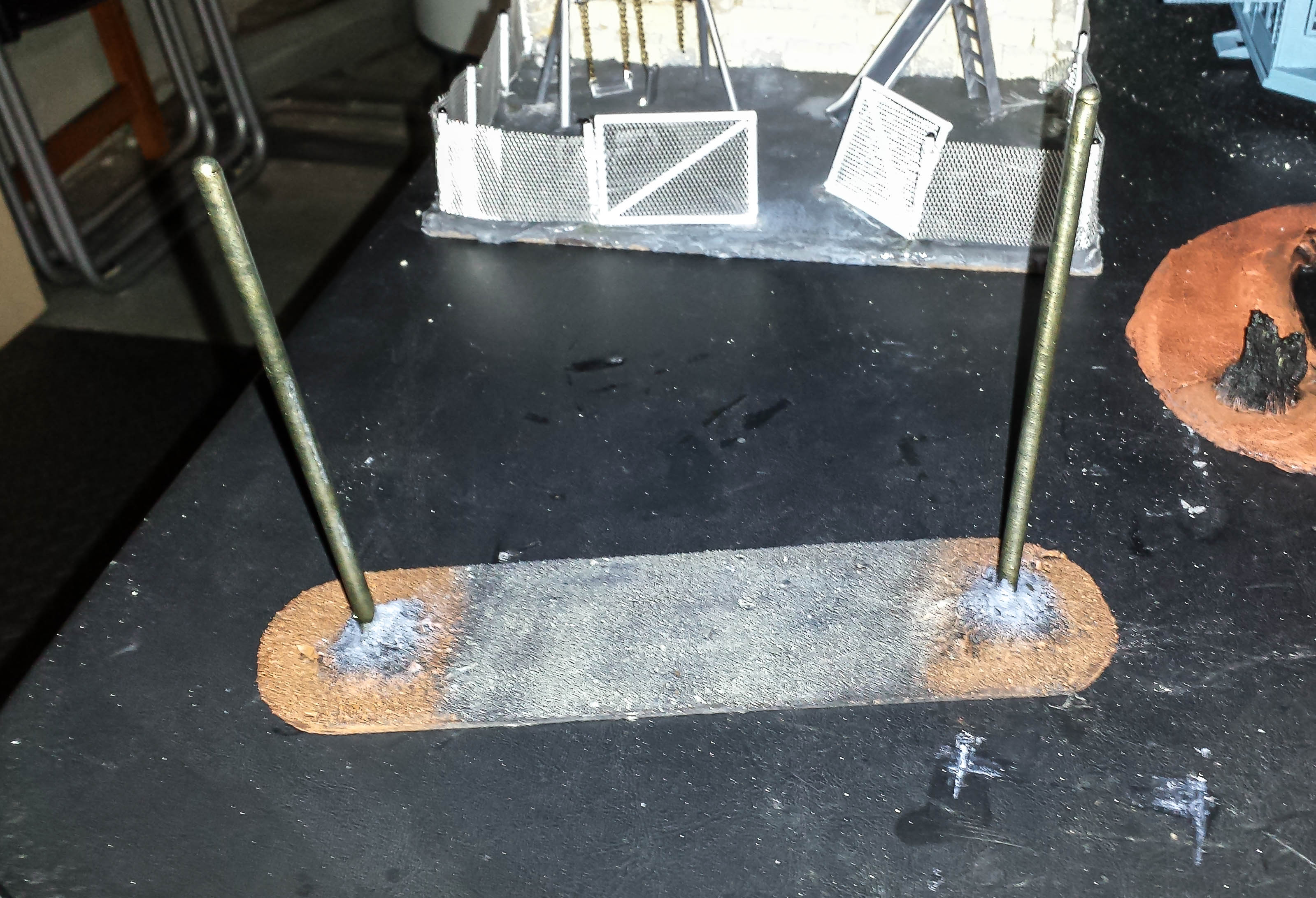 Here are the banner posts. There will be a canvas banner hanging from these poles. The black/tan area is the same width as my roads. The orange area will be covered in grass flock.