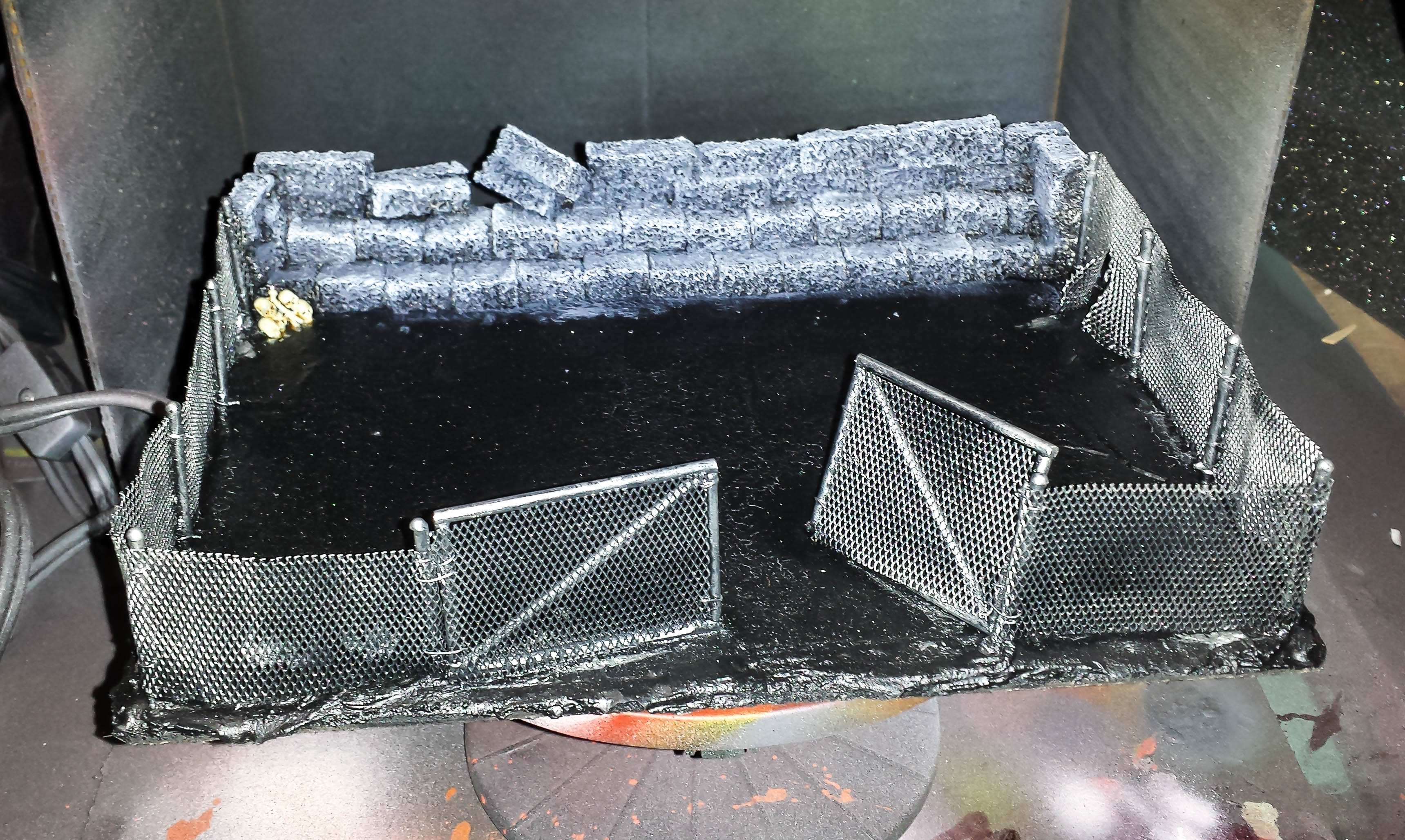 The stone wall and fence are painted. The skulls have been base coated. I just need to finish the skulls and clean up the asphalt before adding the playground bits.