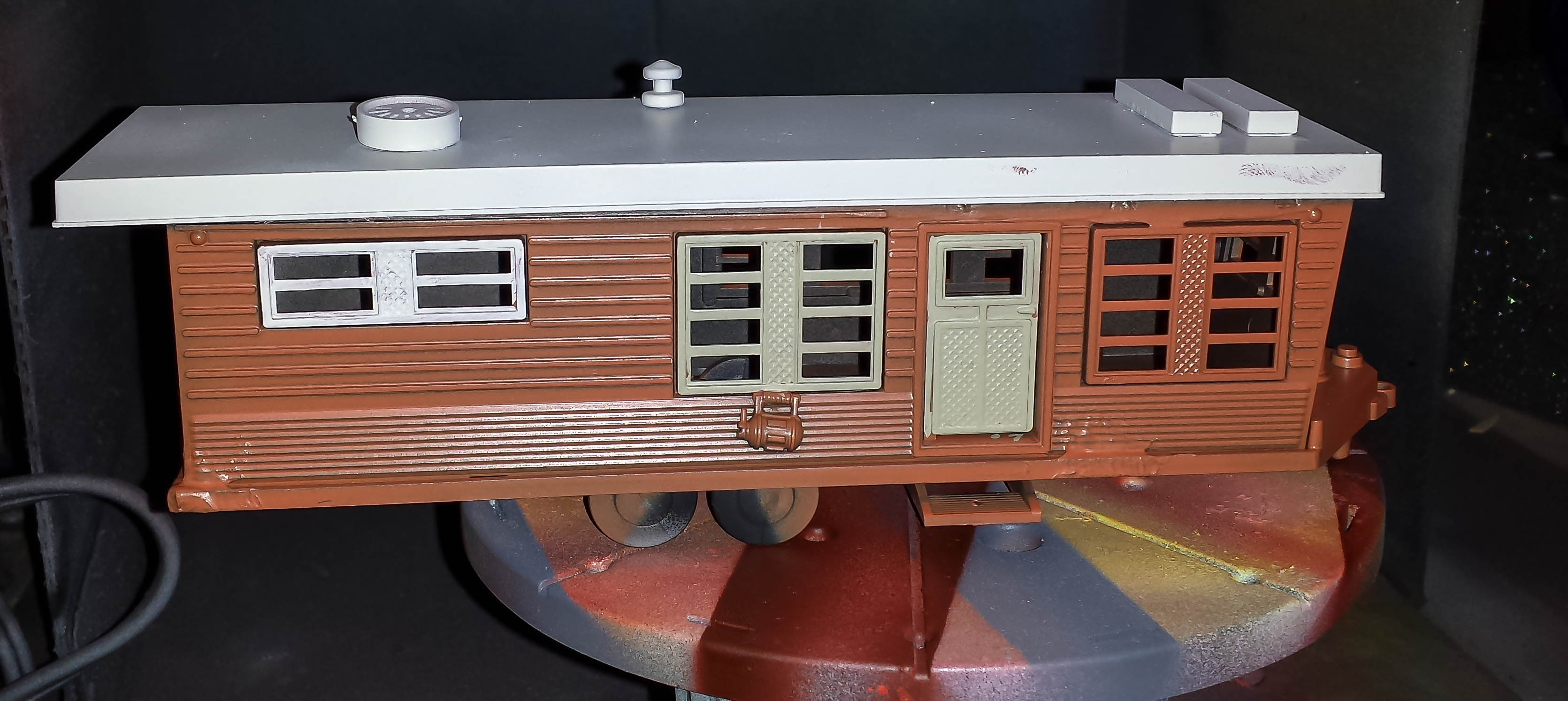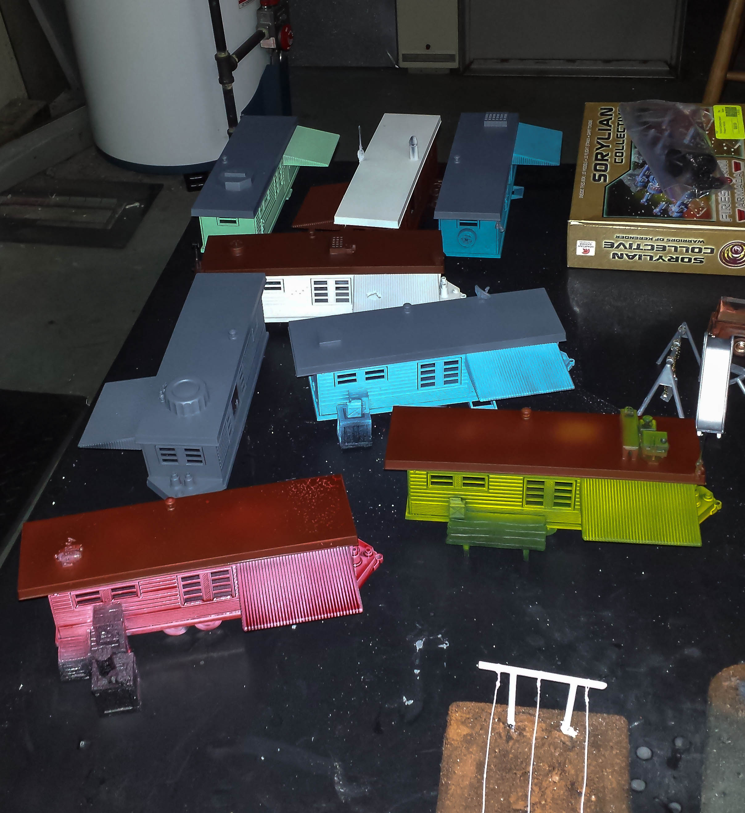 Here are a rainbow of colored trailers. Per a friend’s suggestion, I redid the roofs so they will look less like a bowl of skittles from above. Some of the colors look very bright, but they will be toned down when I start to age them. First, I need to do the detail painting!