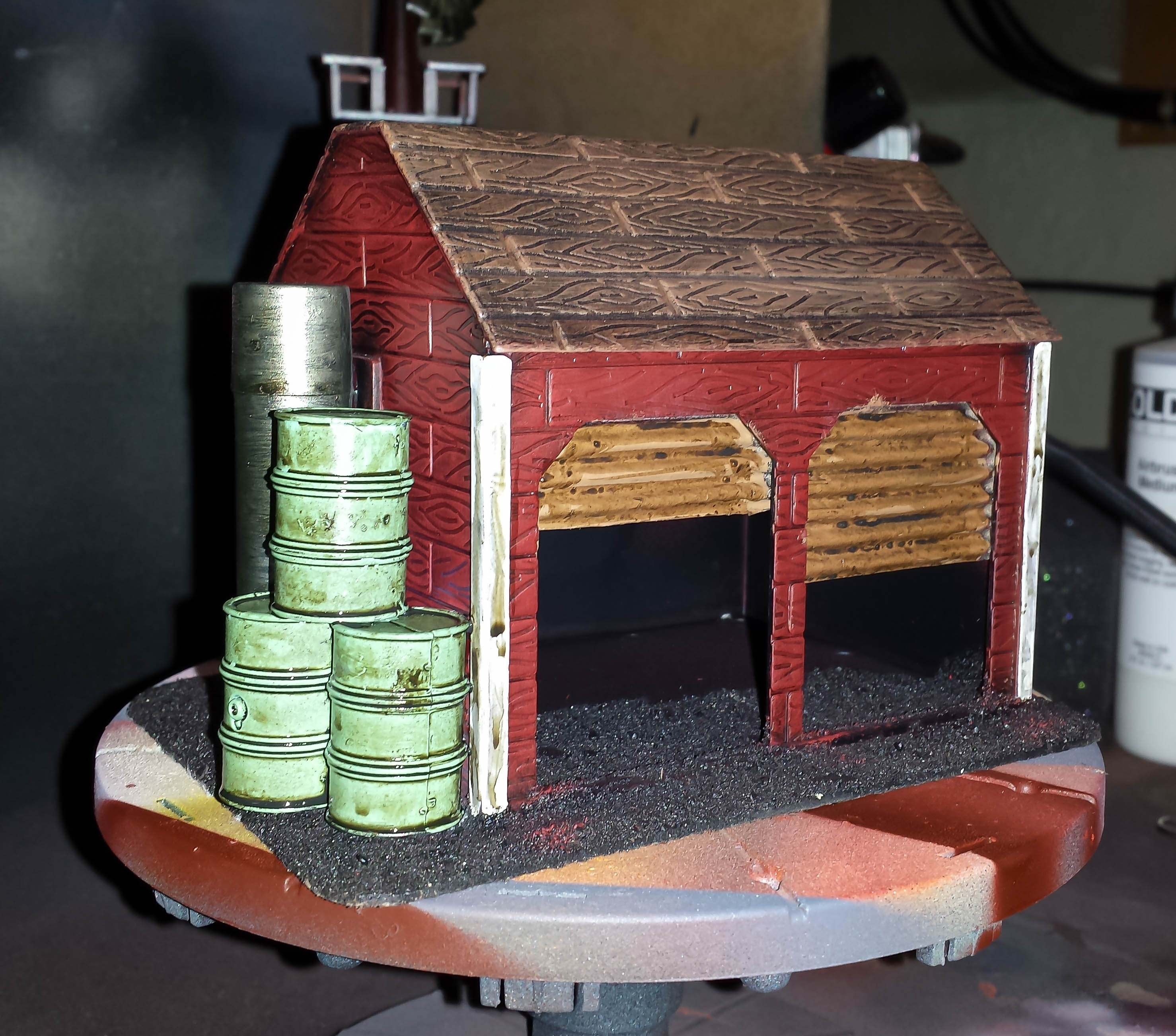 The barn is almost ready to rust. I decided to add some barrels because I don’t really like my chapstick chimney. Now, it doesn’t stand out so badly.