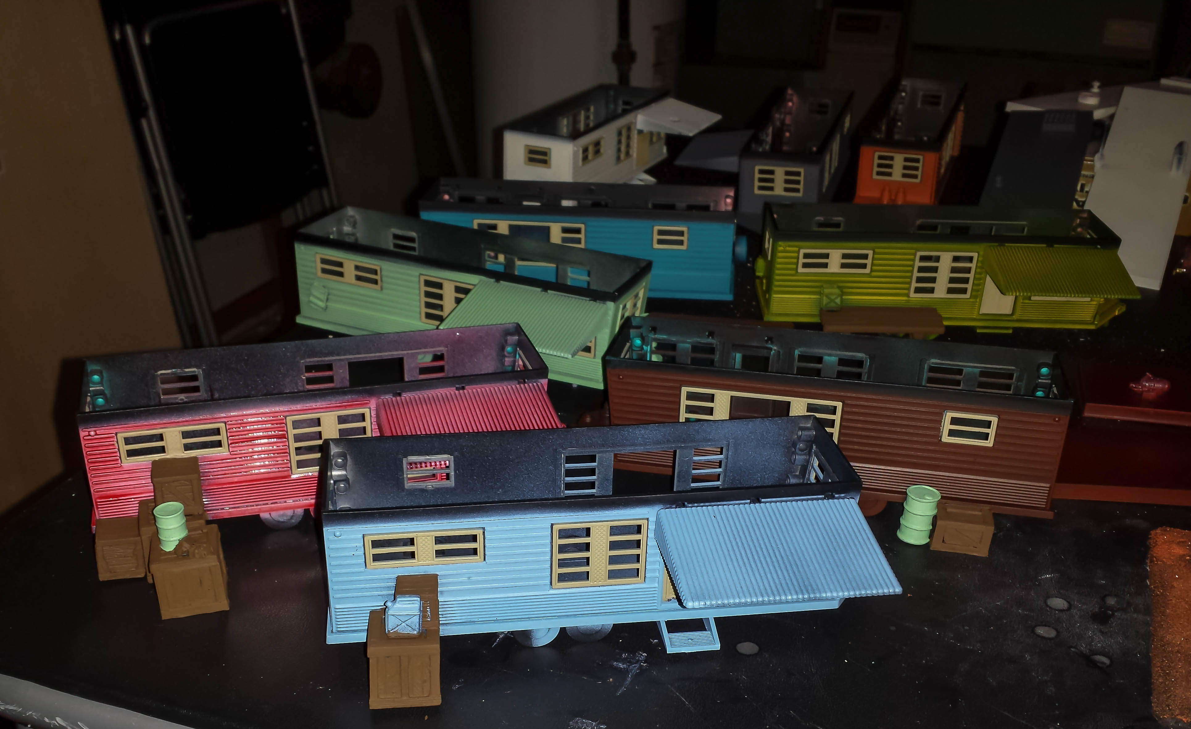 All the windows have been replaced. I also started basecoating the other bits… boxes and barrels are finished. Silver stuff is next.