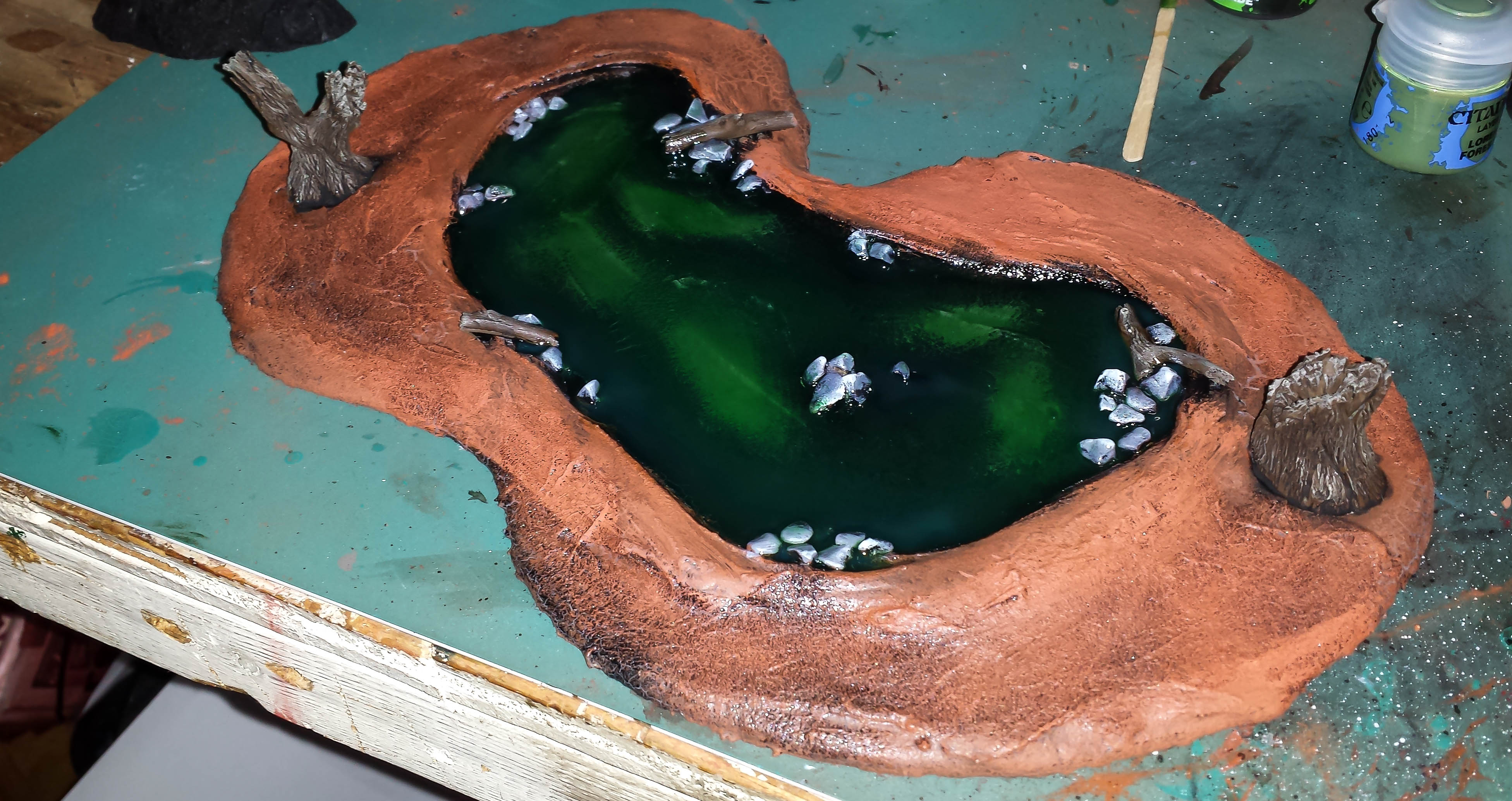 Unfortunately it does not show well in pictures, but I have poured 2 layers of water into the pond. The green floating stuff is actually layers of different green paint on the base. The water is also dyed green. Each layer will be a different color to add to the murky look. I plan on doing at least 2 more layers. In person, there is a sense of depth.