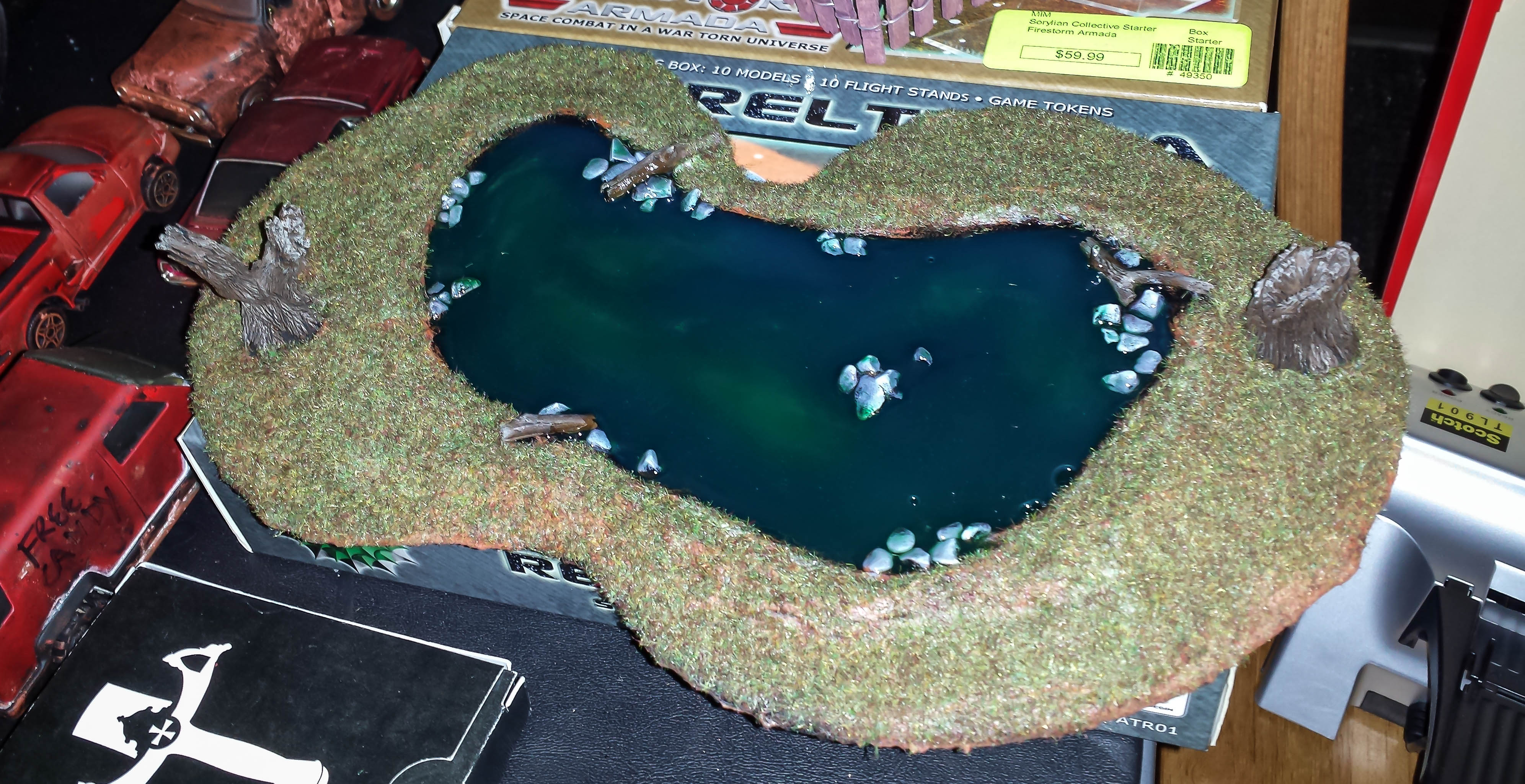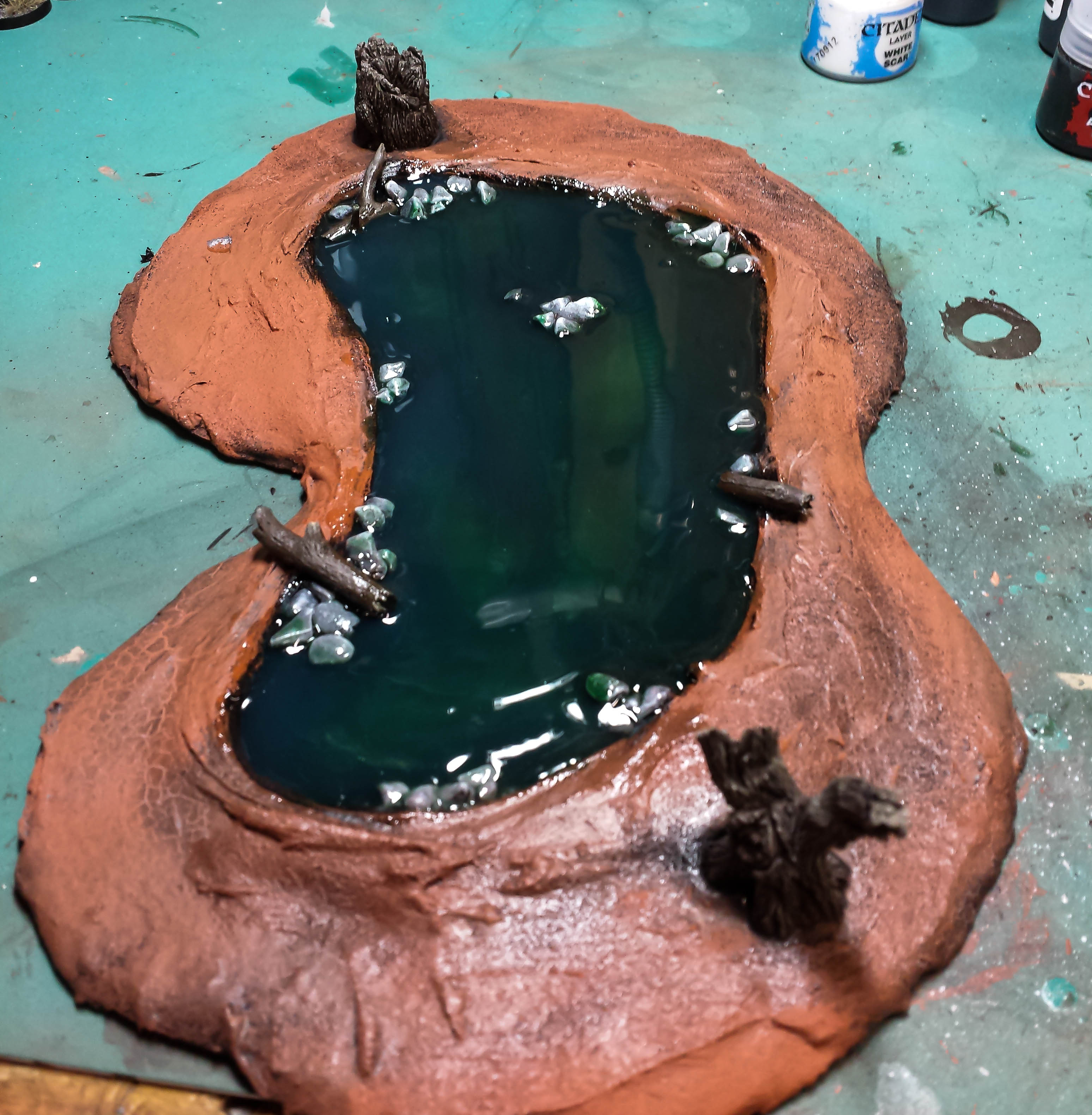 Here is the pond with a 5th clear layer of water, and flock. Somehow, I let some air bubbles form on this layer, which disturbs the perfect smooth surface. Overall, I am happy with the way it turned out. I will be adding some tall grasses and small grass tufts to this before I call it finished.