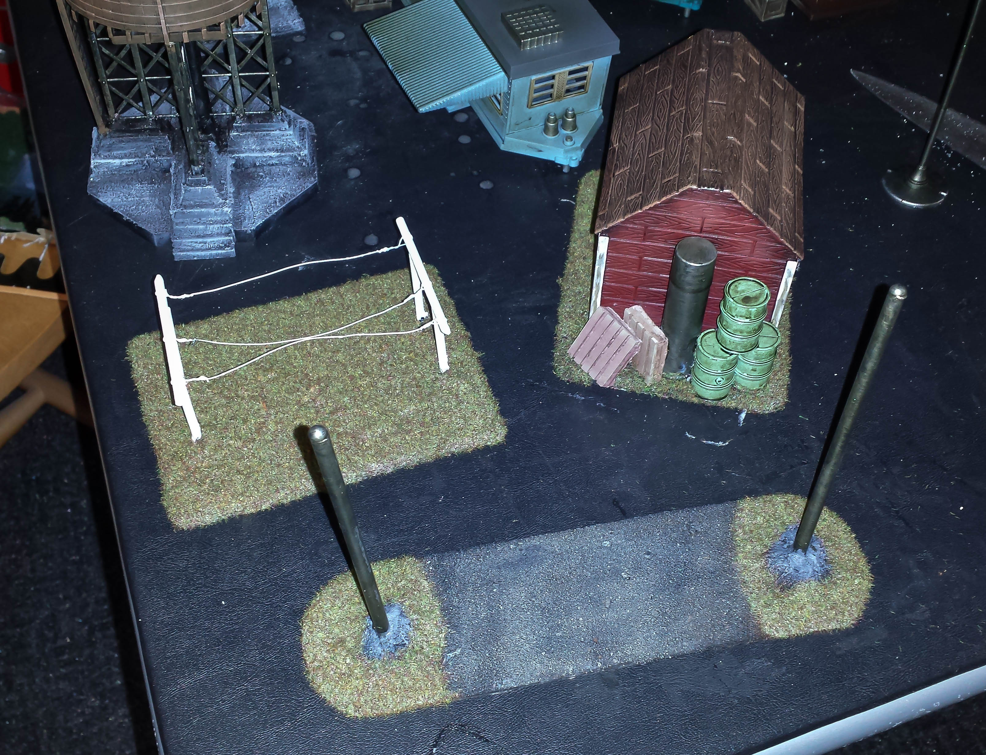 The clotheslines, signposts, and barn are mostly finished. There will be a little rust added.
