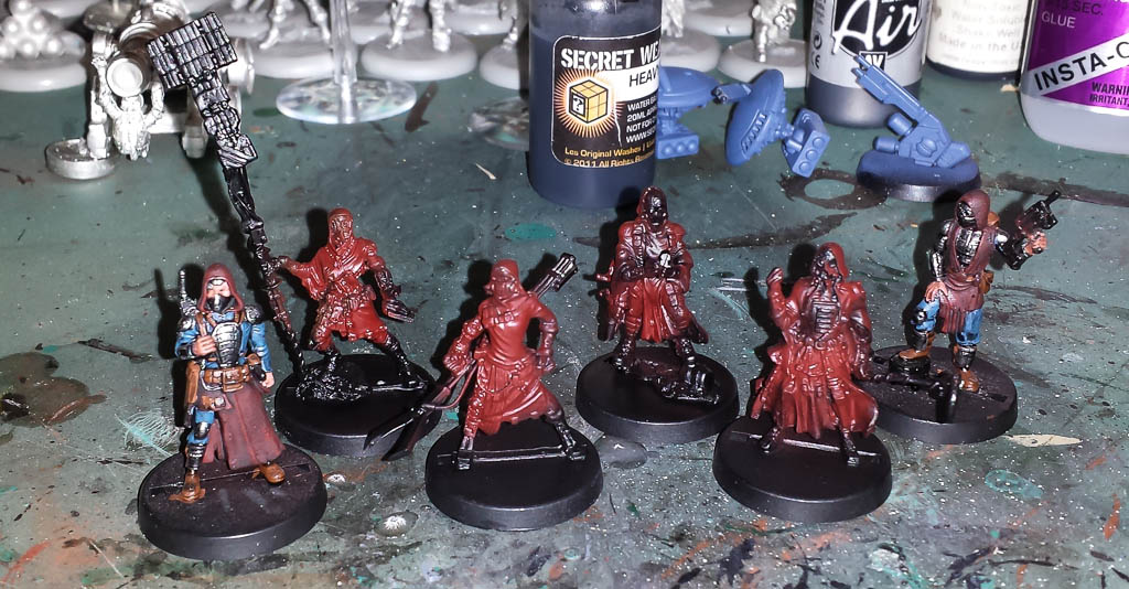 Wreck-Age Reclaimers! I started the 2 guys on the ends a while ago. The middle 4 have been primed, and the cloaks have been basecoated in Vallejo Brick-Red. It is still wet in this pic, and will dry a little darker. After washing them with Secret Weapon armor wash, they should match the other 2 nicely.